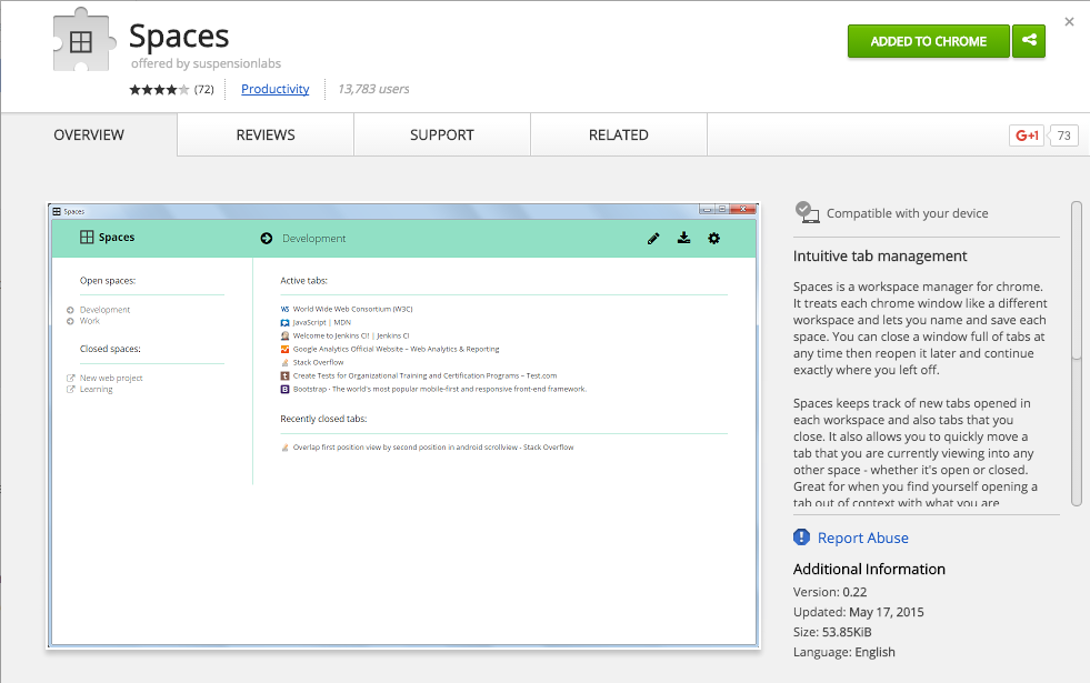 - 多个 Tab 可以归到一个 Space 里边去,一个 Space 就是一个 Chrome 窗口。所以,当你在一个 Space 中的时候,眼前就只有这个窗口(我一般是全屏),其他的 Tab 都可以关闭,或者眼不见为净。